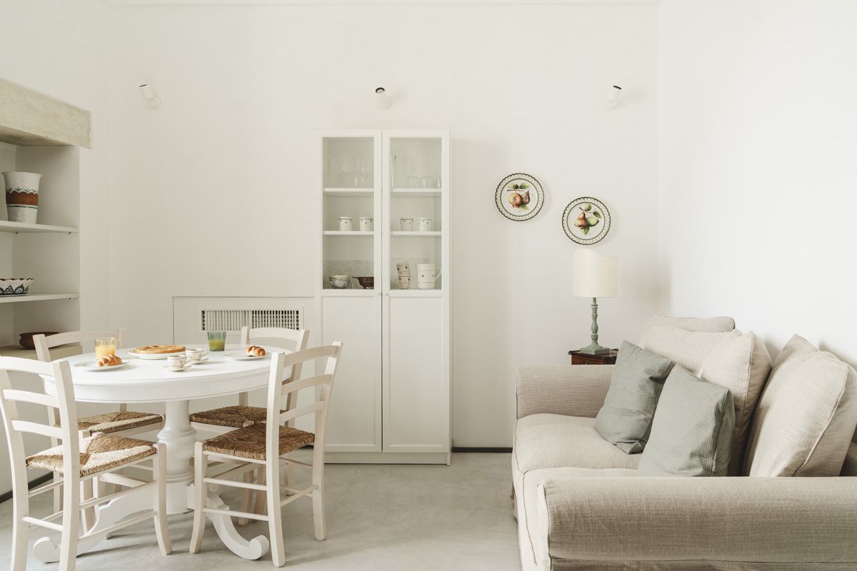 Situata al piano superiore della struttura, con accesso mediante caratteristica scala in pietra locale, la Suite Negramaro si apre su una luminosa zona giorno con angolo cottura completo di stoviglie, tavolo da pranzo ed un comodo divano letto. Dal soggiorno si accede ad un’ampia e luminosa zona notte, con letto matrimoniale, Smart TV, cabina armadio e bagno completo di doccia ed arredi di alto design.